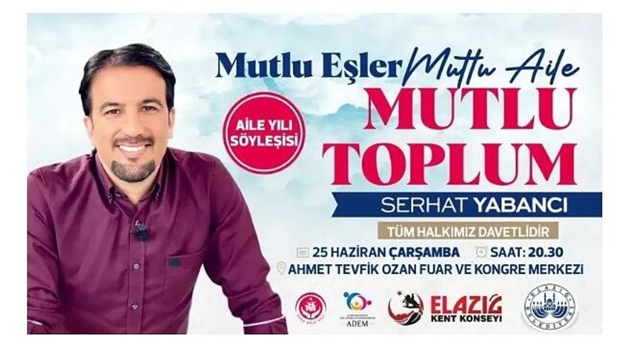 Elazığ Kent Konseyi, Elazığ Belediyesi’nin desteğiyle “Mutlu Eşler, Mutlu Aile, Mutlu Toplum” temalı bir söyleşi düzenliyor. Aile Danışmanı ve yazar Serhat Yabancı’nın konuşmacı olarak katılacağı etkinlik, bugün saat 20.30’da Ahmet Tevfik Ozan Fuar ve Kongre Merkezi’nde gerçekleştirilecek.