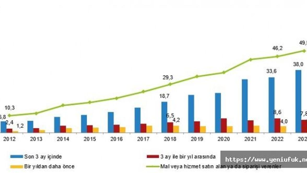 Son 12 ayda İnternet kullanan bireylerin İnternet üzerinden özel kullanım amacıyla mal veya hizmet satın alma ya da sipariş verme (e-ticaret) oranı, 2022 yılında %46,2 iken 2023 yılında %49,5 oldu. Cinsiyete göre İnternet üzerinden mal veya hizmet satın alma ya da sipariş verme oranı erkeklerde %52,4 kadınlarda %46,6 oldu. Bu oran, en son mal veya hizmet satın alma ya da sipariş verme zamanlarına göre incelendiğinde; bireylerin %38,0'ının son 3 ay içinde (2023 yılı ilk 3 ayı) mal veya hizmet satın aldığı ya da sipariş verdiği görüldü.