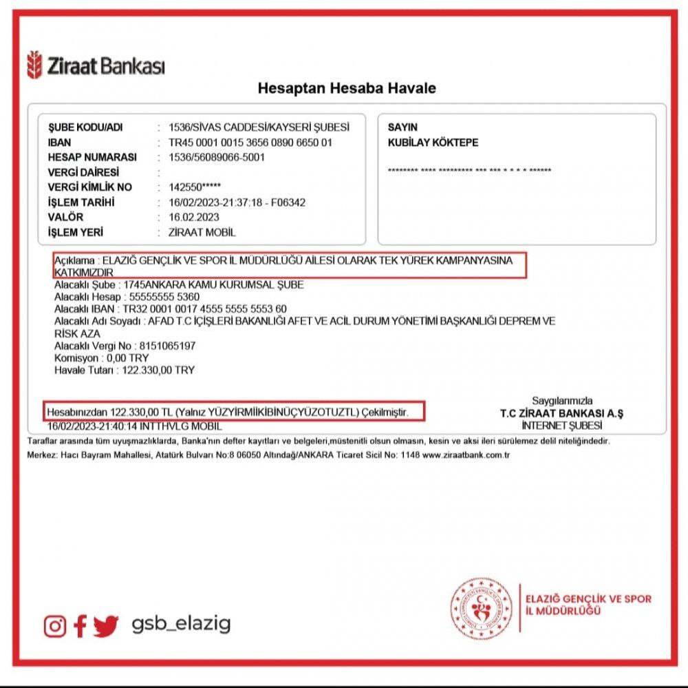 Elazığ Gençlik ve Spor İl Müdürlüğü tarafından yapılan açıklamada; Elazığ Gençlik ve Spor İl Müdürlüğü Ailesi olarak başlatılan Türkiye Tek Yürek kampanyasına katılarak bizde tüm depremzedelerimiz için 122 Bin 330 TL bağışta bulunduk. Allah kabul etsin” denildi.