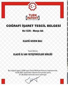 Arı Yetiştiricileri Birliğinin Türk Patent ve Marka Kurumuna yapılan başvurusu sonucunda Elazığ Geven Balı markası coğrafi işaretli ürünü olarak tescillendi.