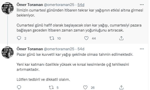 Vali Dr. Ömer Toraman sosyal medyadan yaptığı açıklamada karın hafta sonu etkili olacağını hatırlatarak vatandaşları uyardı.
