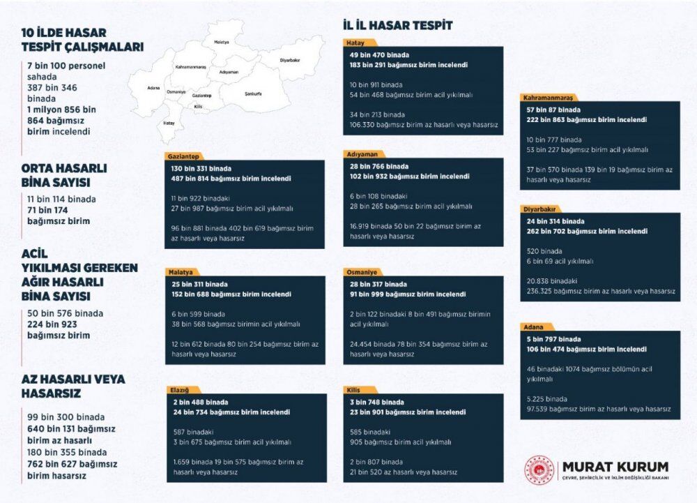 Kahramanmaraş’ta 7.7 ve 7.6 büyüklüğünde iki farklı yıkıcı deprem meydana geldi. Meydana gelen deprem Elazığ başta olmak üzere çok sayıda ilde yıkıma sebebiyet verdi. Çevre, Şehircilik ve İklim Değişikliği Bakanlığı, depremin ardından yapılan hasar tespit çalışmalarını paylaştı.