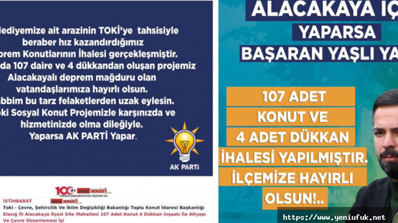 “Belediyemize ait arazinin TOKİ’ye tahsisiyle beraber hız kazandırdığımız Deprem Konutlarının ihalesi gerçekleşmiştir. Toplamda 107 daire ve 4 dükkandan oluşan projemiz; Alacakayalı deprem mağduru olan vatandaşlarımıza hayırlı olsun. Rabbim bu tarz felaketlerden uzak eylesin. Toki Sosyal Konut Projemizle karşınızda ve hizmetinizde olma dileğiyle. Yaparsa Ak Parti yapar” dedi.